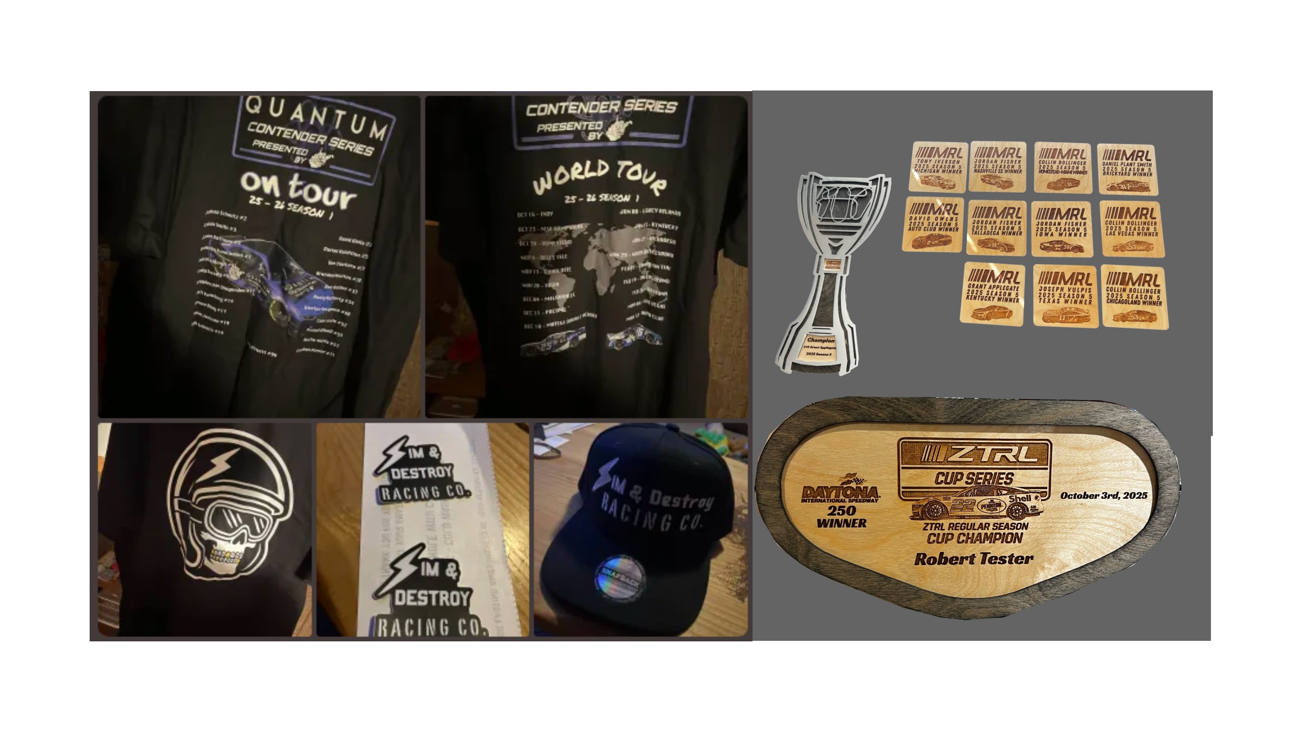 Engraved wooden trophies and plaques built to reward race wins, champions, and season moments.